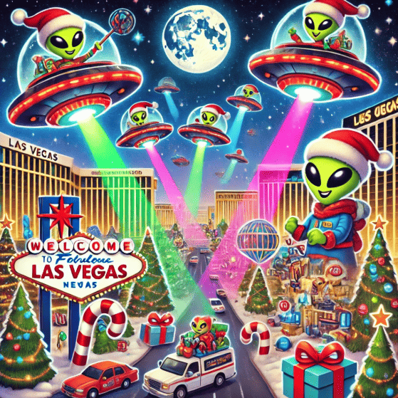 Gra slotowa Invading Vegas: Las Christmas Podczas lotu nad Las Vegas statek kosmiczny zderzył się z saniami Świętego Mikołaja, a teraz Boże Narodzenie jest zagrożone. Małe zielone ludziki postanowiły zostać elfami i pomóc rannemu Świętemu Mikołajowi.